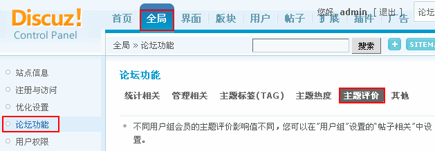 论坛后台 => 全局 => 论坛功能 => 主题评价,如下图: