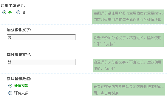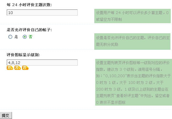 是否允许评价自己的帖子:设置是否允许评价自己的主题,评价自己的主题无积分奖励。