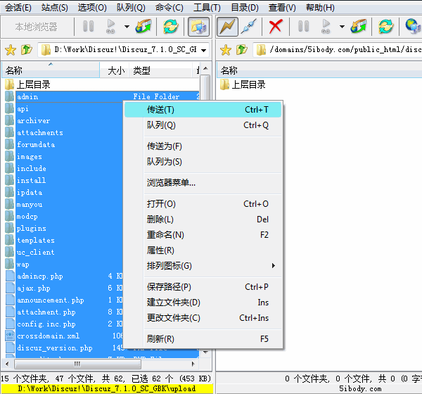 将其中 upload 目录下的所有文件使用 FTP 软件以二进制方式 (常见 FTP 软件二进制的设置方法 http://faq.comsenz.com/viewnews-373) 上传到空间 (以下截图中使用的 FTP 软件为 FlashFXP,有关此工具的使用教程详见:FTP 使用教程),如下图所示: