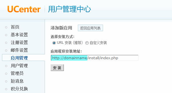 上传完毕后,开始在浏览器中安装 Discuz! 7.1 ,登录 UCenter 1.5 => 应用管理 => 添加新应用 => URL 安装 (推荐):
