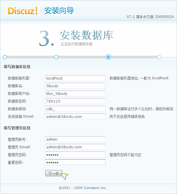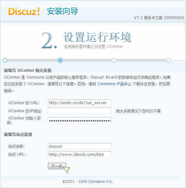 这里会自动获取 UCenter 信息,所以无需手动配置,直接点击 「下一步」 进入数据库信息配置界面: