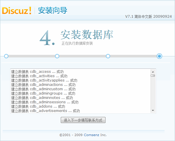 填写好 Discuz! 数据库信息及管理员信息后,点击 「下一步」,系统会自动安装数据库直至完毕,如下图所示:
