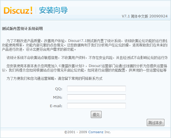 填写好联系方式后点击 「提交」,也可以点击 「跳过本步」 直接完成安装。
