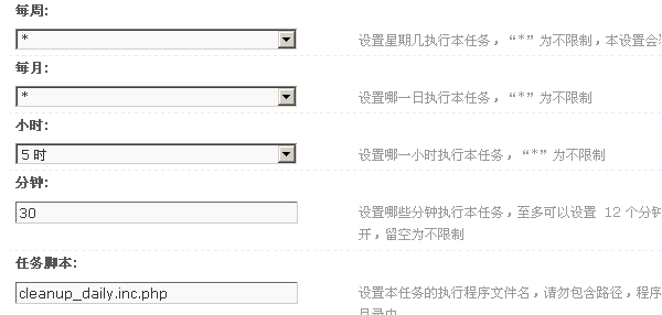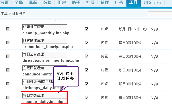 任务脚本:程序脚本统一存放于 ./include/crons/ 目录中,该任务的脚本为 cleanup_daily.inc.php