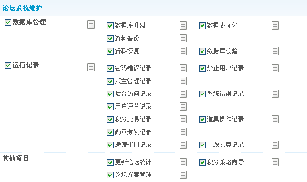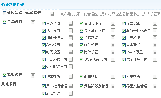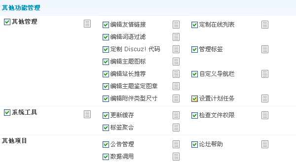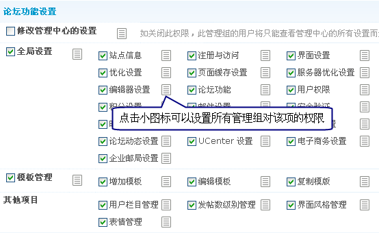 2 、论坛资源设置可以设置该管理组对用户,版块及主题分类/分类信息的管理权限;