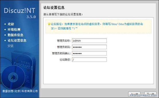 填写管理员名称、密码。论坛路径默认即可