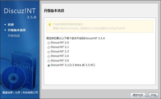 选择论坛当前的版本,本例使用Discuz!NT 3.1来做升级的,如果您是别的版本,只要选择其他版本号即可,然后点升级