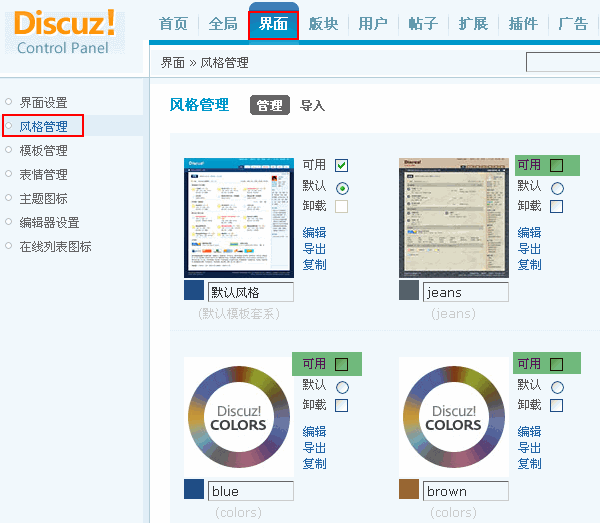 用管理员登录论坛后台 =》 界面 =》 风格管理:将非默认的其他所有风格都设置为不可用,如图: