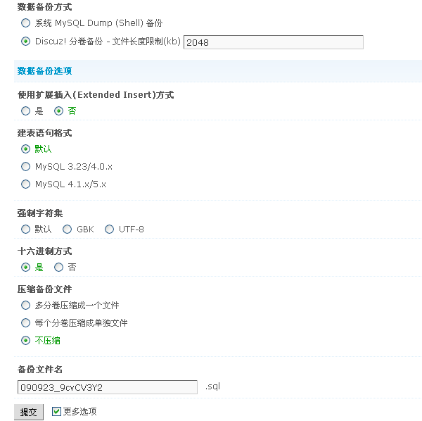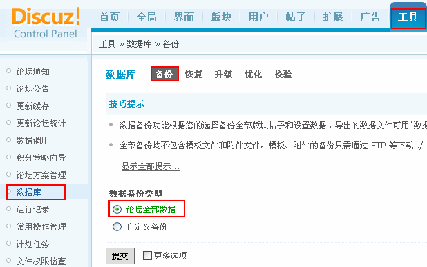 虚拟主机用户推荐直接在论坛后台进行备份,用管理员登录论坛后台 =》 工具 =》 数据库 =》 备份:推荐备份 「论坛全部数据」,如图: