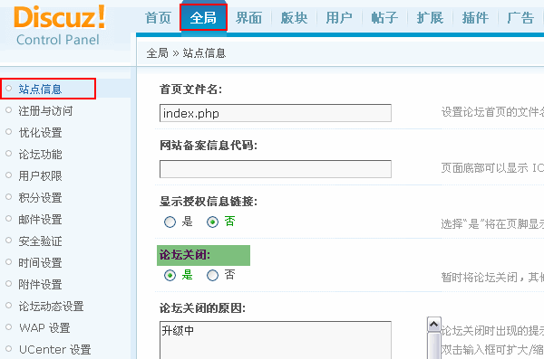 用管理员登录论坛后台 =》 全局 =》 站点信息 =》 论坛关闭:选择 「是」,如图: