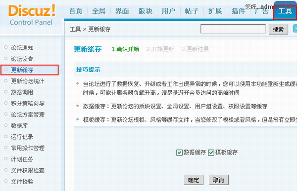 2 、使用管理员身份登录论坛,进入后台 =》 工具 =》 更新缓存。
