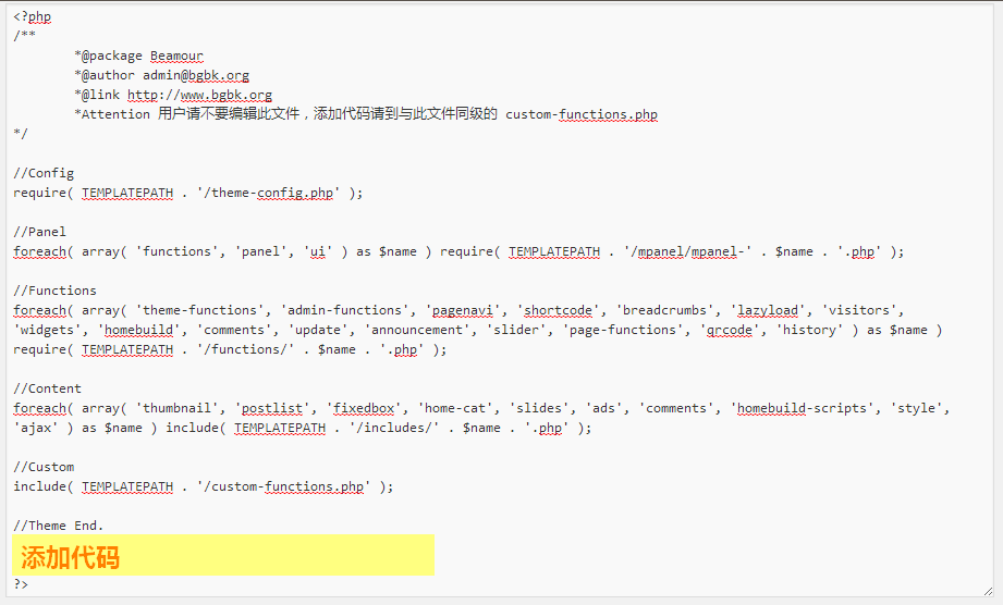 滚动到 functions.php 文件的最后,如果最后不是 ?> 则直接添加到最后,如果文件最后是 ?> 则需要在 ?> 前添加: