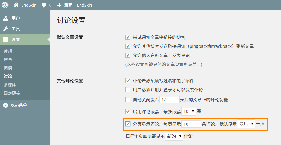 勾选 「分页显示评论」,还可以在后边设置每页显示的评论数量,以及默认显示新评论还是旧评论。