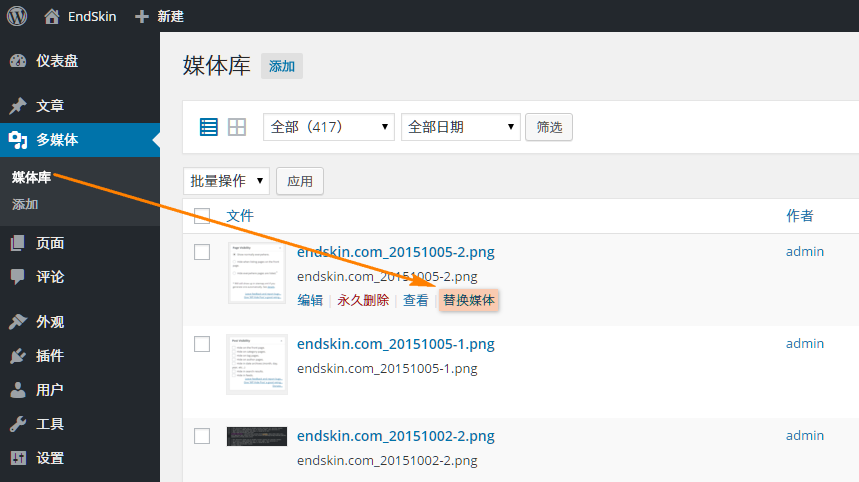 使用插件之后,要替换一个媒体图片的文件,需要先进入后台的 「媒体库」 页面,如果你使用的是网格视图需要先切换到列表视图。