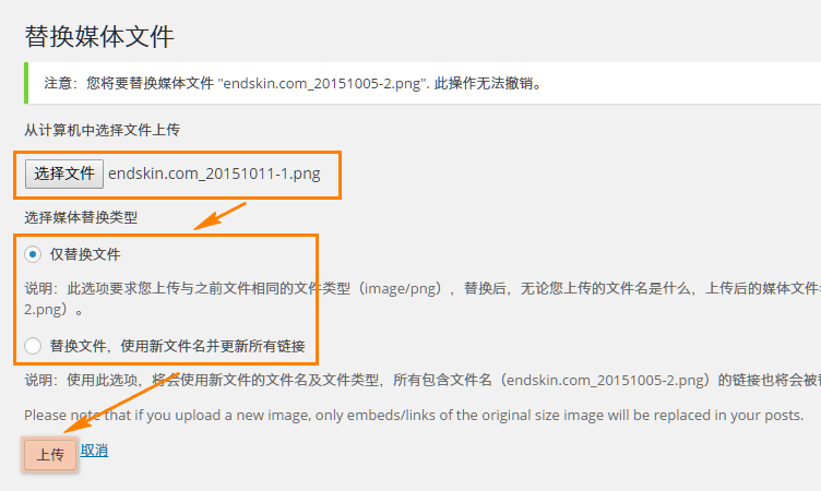 在这里可以使用 「选择文件」 按钮上传新的图片文件。选择好文件之后,下方有两个选项,分别是直接用同样的文件名替换之前的文件 (需要原文件和新文件后缀名相同);以及使用新的路径,然后自动将图片的链接指向新文件。