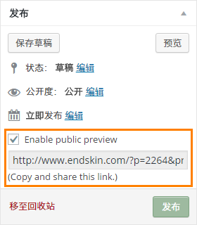 无需再次保存文章,灰色文本框里的预览链接就能生效,可以复制它,并分享给其他人。打开预览链接就能直接在前台预览文章,无需登录。