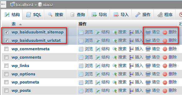 二、登录 phpmyadmin 选中这两个表清空或删除