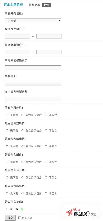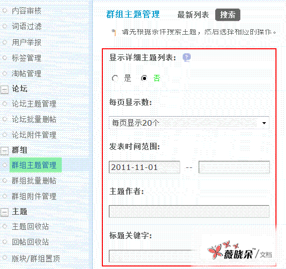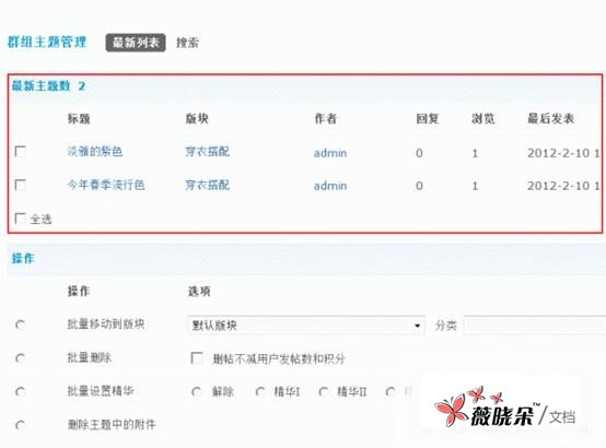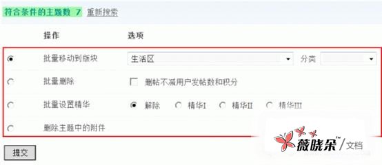 該功能主要用於對羣組主題的管理工作,搜索出符合一定條件的主題,然後進行批量操作。包括:批量移動到版塊、批量刪除、批量設置精華、刪除主題中的附件。下面主要介紹一下這個功能的使用方法。