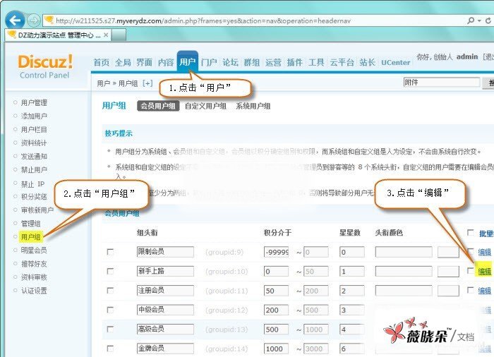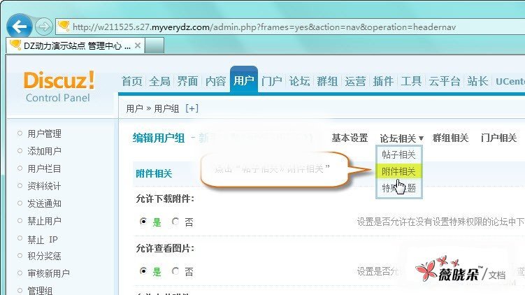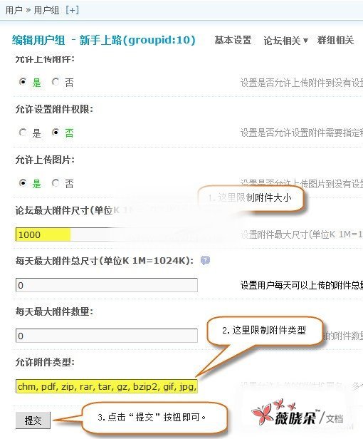 Discuz 教程:如何限制用户上傳附件大小及類型? 1. 進入論壇後台,點擊 「用户》 用户組》 編輯」,編輯您需要設置的用户組; 2. 點擊 「論壇相關》 附件相關」,進入設置界面; 3. 設置 「論壇最大附件尺寸」 和 「允許附件類型」 點擊 「提交」 按鈕,設置完成。 小雨2016-11-08T23:47:37+08:00發表於:2013-05-18|Discuz!|