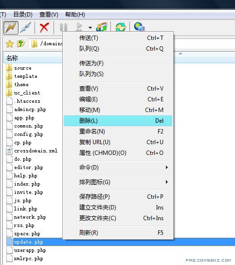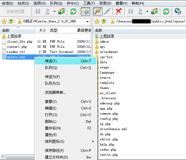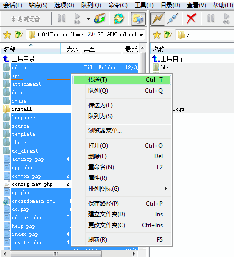 通過 FTP 軟件上傳新的 UCenter Home 程序,將 upload 文件夾下除 config.new.php 、 install 目錄外,其他程序全部上傳並覆蓋原有文件。