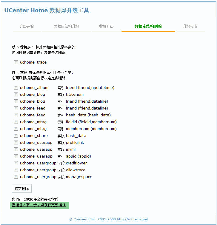 數據庫結構刪除,版本更新後多餘的數據表和字段,在這裏可以選擇是否刪除,如果這些新增的表或者字段不是你之前安裝的插件的表和字段的話,建議選擇刪除。不刪除可以忽略掉直接點擊最下方的 「直接進入下一步緩存更新操作」 。