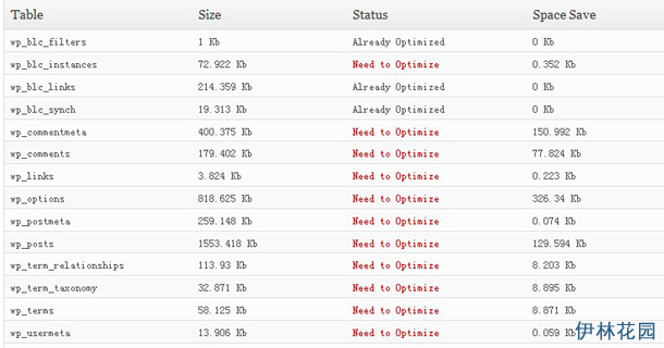 在下方會以表格方式呈現數據庫表名稱、大小、狀態、優化節省的空間,有紅色標記的就是要優化的部分。