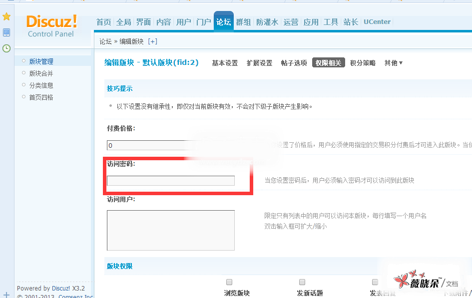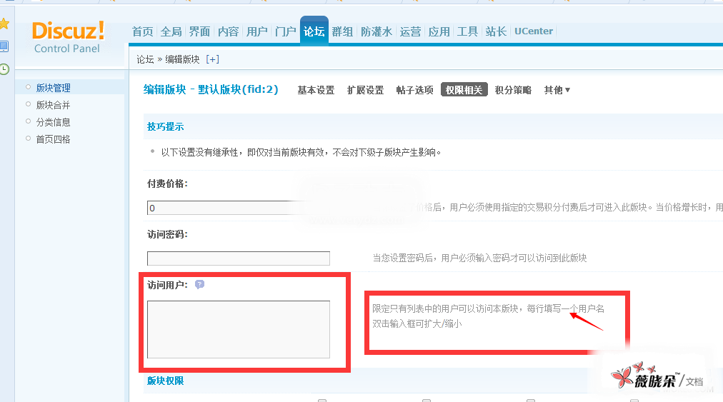 Discuz 教程:如何設定版塊的訪問密碼與限制訪問的使用者 進入後臺--論壇--版塊編輯 選擇好要設定的版塊 設定密碼,如圖 還可以設定限制訪問此版塊的使用者,注意每行只能填寫一個使用者名稱。 小雨2016-02-10T20:39:42+08:00發表於:2012-12-31|Discuz!|