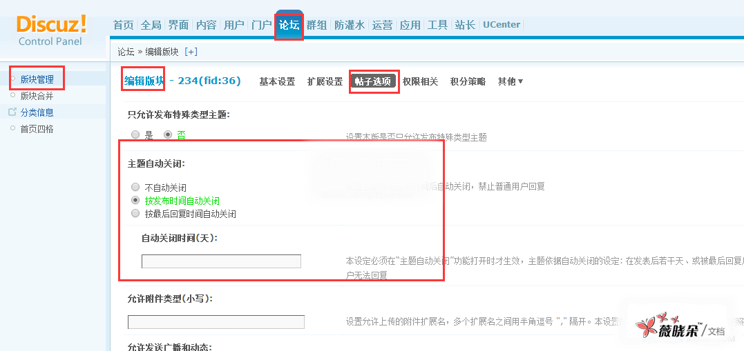 Discuz 教程:如何設定主題帖自動關閉 在後臺--論壇--版塊--編輯--帖子選項,設定主題自動關閉即可。按照自己想要的設定情況來設定。 小雨2016-02-10T19:12:05+08:00發表於:2012-02-19|Discuz!|