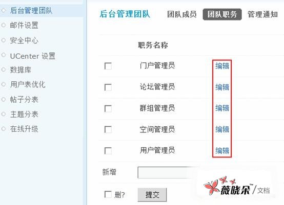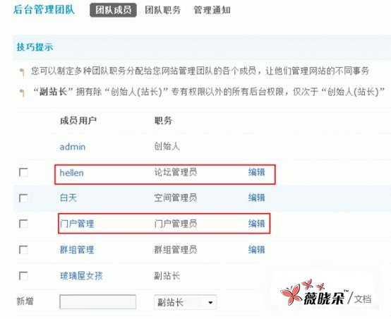 創始人可以制定多種團隊職務分配給你網站管理團隊的各個成員,讓他們管理網站的不同事務,包括副站長、門戶管理員、論壇管理員、群組管理員、空間管理員和使用者管理員。