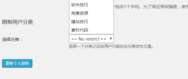 首先你需要安裝 Restrict Author Posting 外掛,啟用外掛之後進入需要限制分類的使用者的個人資料編輯頁面,滾動到最下邊就會看到限制使用者分類的選擇框了: